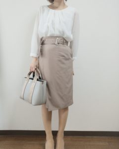 ドロップショルダーのブラウスにベルト付きのラップ風タイトスカートを合わせた、綺麗めカジュアルのコーディネートです。