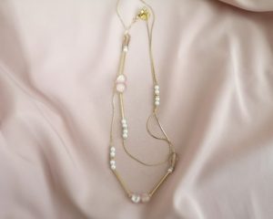 ピンクのビーズとパールのMIXがフェミニンな印象のネックレス。