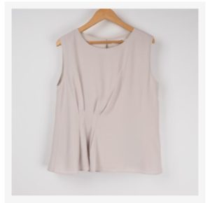 片側のみのタックによるアシンメトリーのディテールが新鮮さを感じさせる、ノースリーブブラウス。